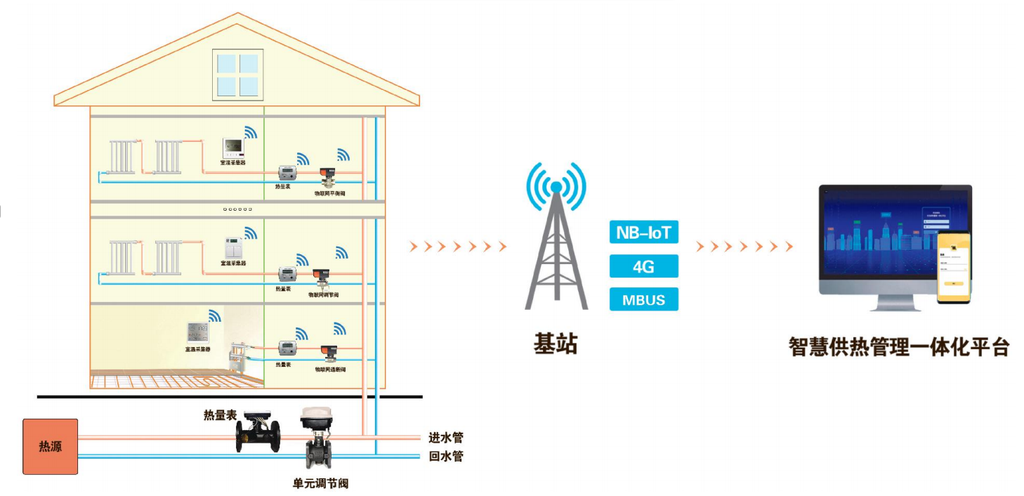 1. 全域感知(IoT): 在樓宇熱力入口、單元管道井及用戶室內(nèi)部署溫濕度、壓力、流量傳感器,構(gòu)建起覆蓋“源-網(wǎng)-站-戶”的全鏈條數(shù)據(jù)感知網(wǎng)絡(luò)。
