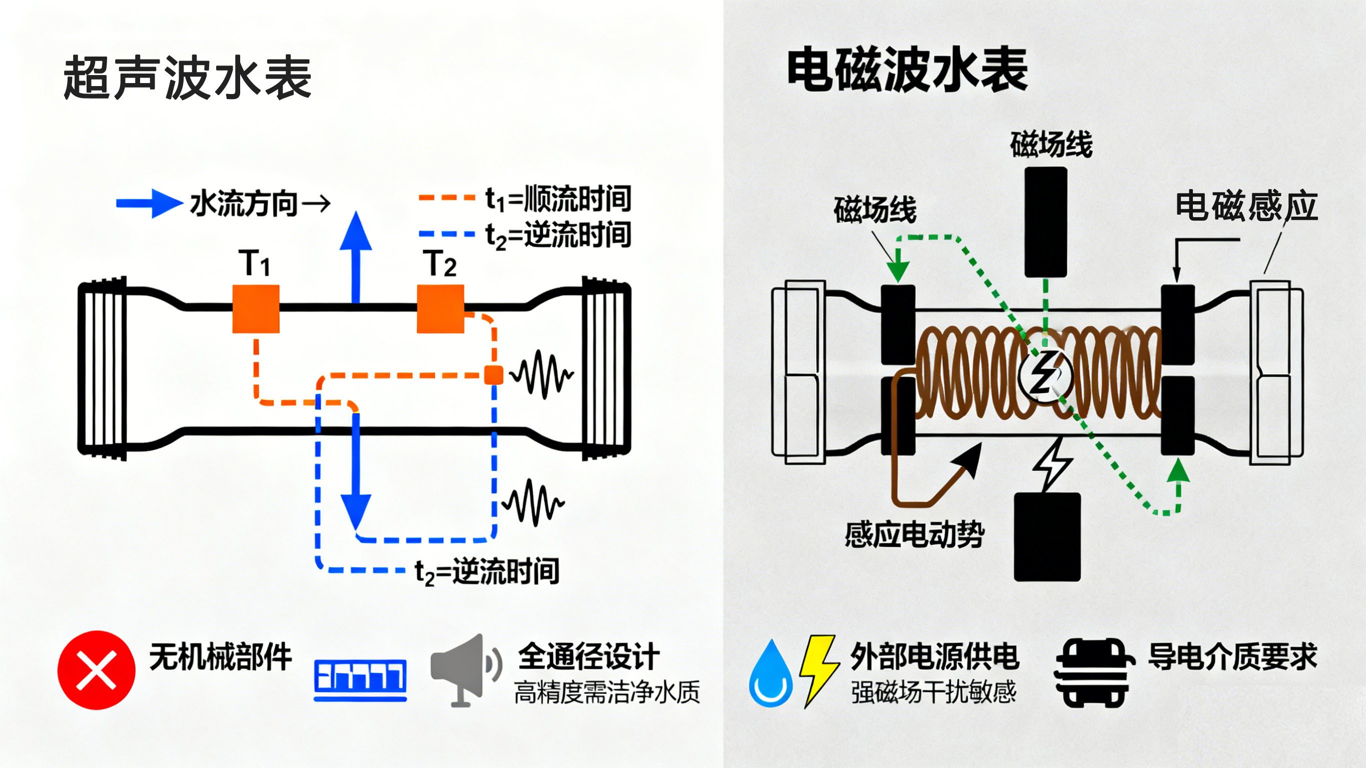 | 測(cè)量原理 | 法拉第電磁感應(yīng) | 超聲波時(shí)差法 |